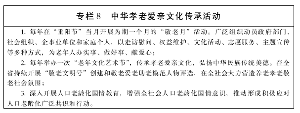 1.营造良好社会氛围。深入开展敬老爱老助老主题宣传和评选表彰活动,广泛开展走访慰问老年人和扶老助老志愿服务,推动敬老宣传教育进学校、进家庭、进社区、进机关、进企业。开展涉老主题法治宣传教育活动,推动普法宣传教育规范化和常态化,帮助老年人提高守法意识和依法维权意识。争创“积极应对人口老龄化重点联系城市”,创建全国示范性老年友好型社区。健全老年人优待政策措施,开展爱老敬老优待服务和活动。