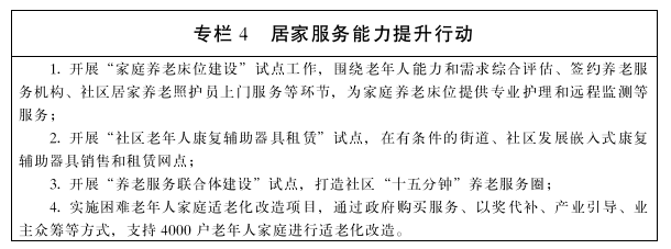 1.实施居家服务供给能力提升行动。强化家庭赡养老年人的主体责任,落实监护人对孤寡老人的监护责任。通过落实税收优惠、带薪护理假、家庭照顾者技能培训等措施,鼓励家庭承担养老基础性功能,切实巩固居家养老的基础地位。支持有条件的地区开展“家庭照护床位”试点,为经济困难的失能和半失能老年人建设家庭养老床位,提供居家养老上门服务。通过政府购买服务、志愿服务等方式,为长期照护失能失智老年人的家庭成员提供“喘息服务”。开展养老护理员进家庭试点工作,培育一批以照护为主业、辐射社区周边、兼顾上门服务的专业化服务机构和组织,运营社区、村养老服务设施,上门为居家老年人提供生活照料、家务料理、康复护理、精神慰藉等服务,为老年人提供更有效率,更有温度的服务。