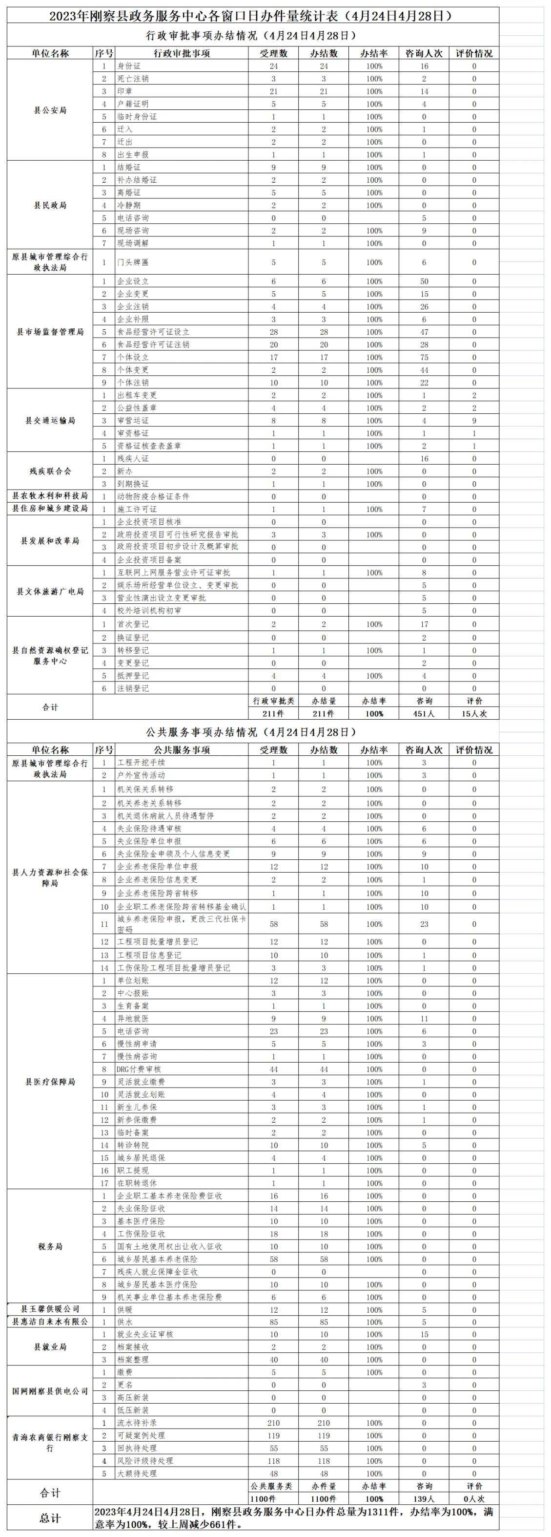 2023年刚察县政务服务中心各窗口日办件量统计表(4月24日4月28日)