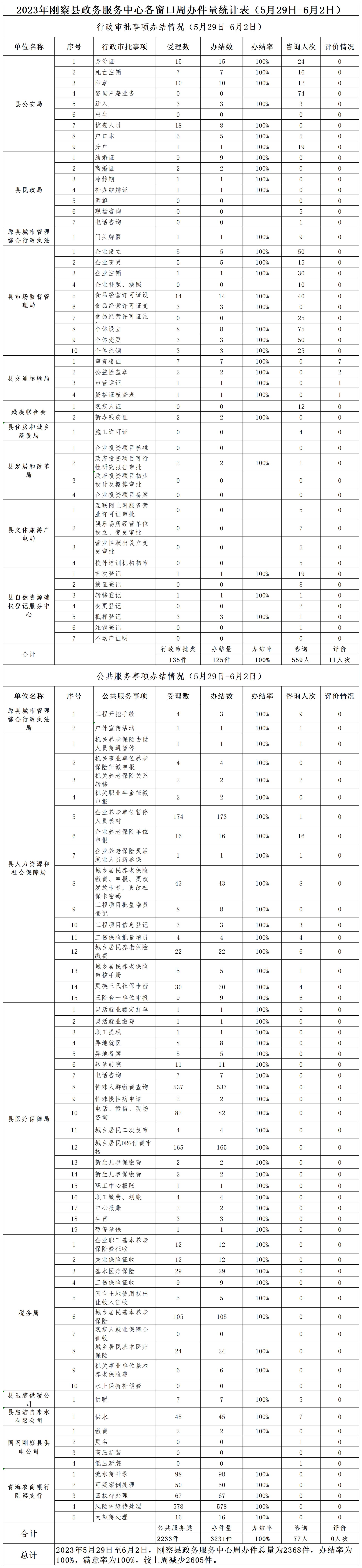 2023年刚察县政务服务中心各窗口周办件量统计表(5月29日-6月2日)