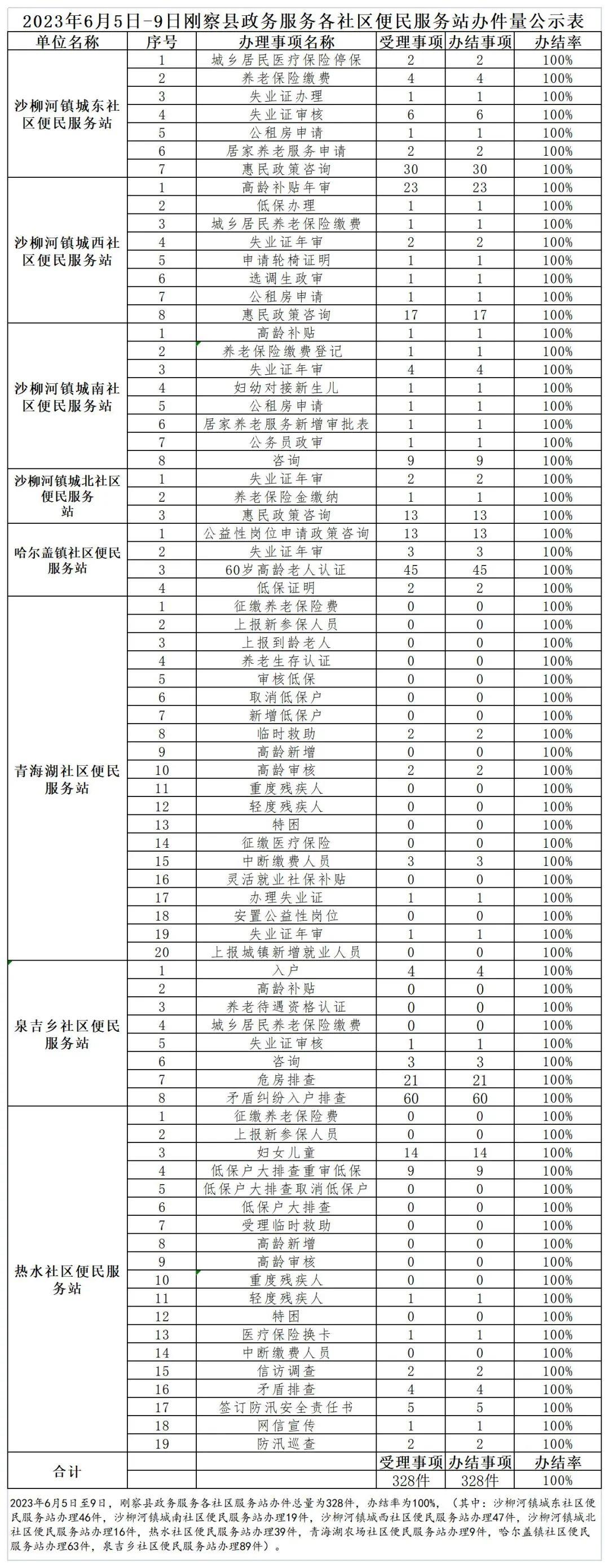 2023年6月5日-9日刚察县政务服务各乡镇便民服务中心办件量公示表