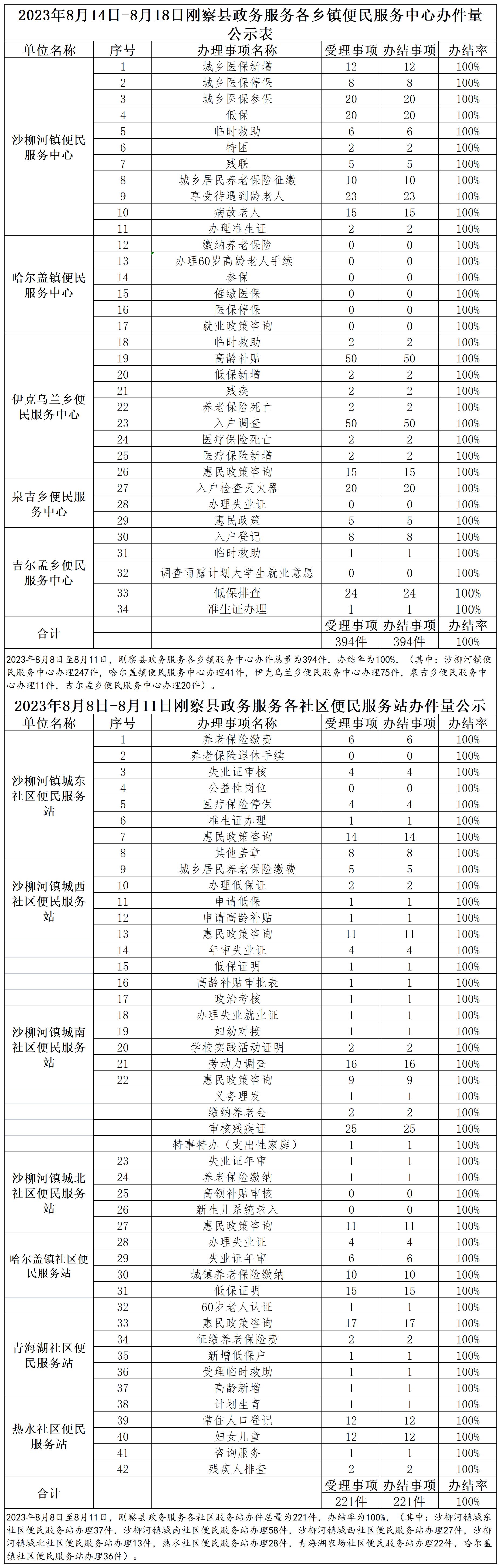 2023年8月14日-8月18日刚察县政务服务各乡镇便民服务中心办件量公示表