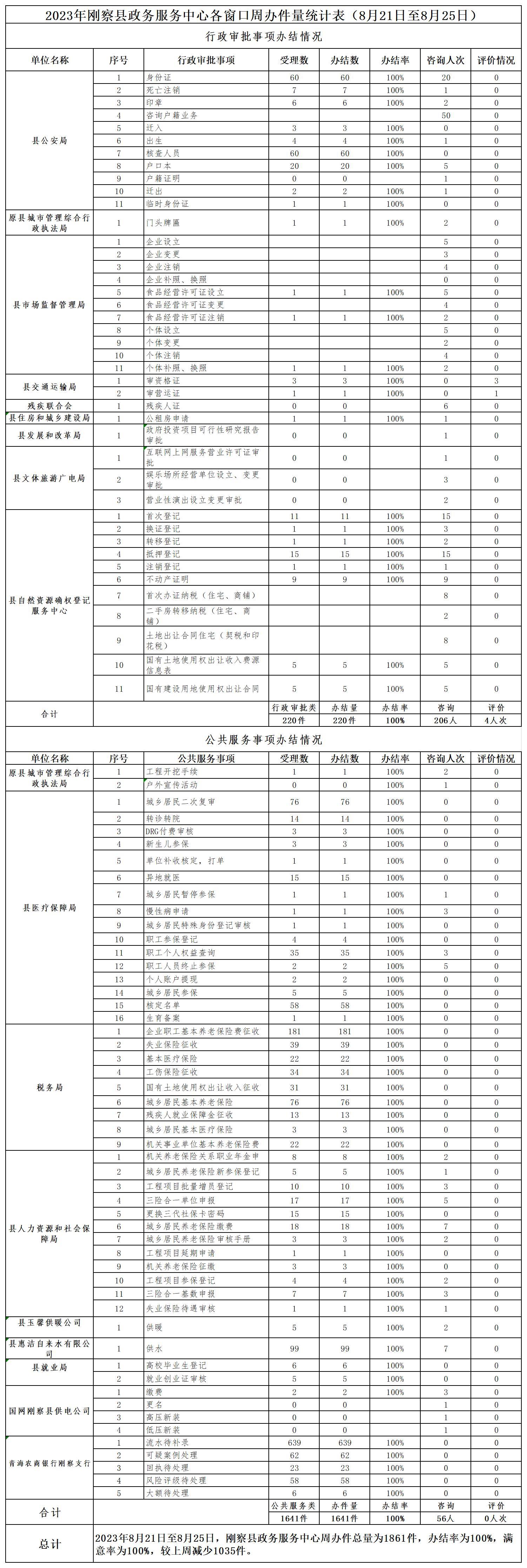 2023年刚察县政务服务中心各窗口周办件量统计表(8月21日至8月25日)