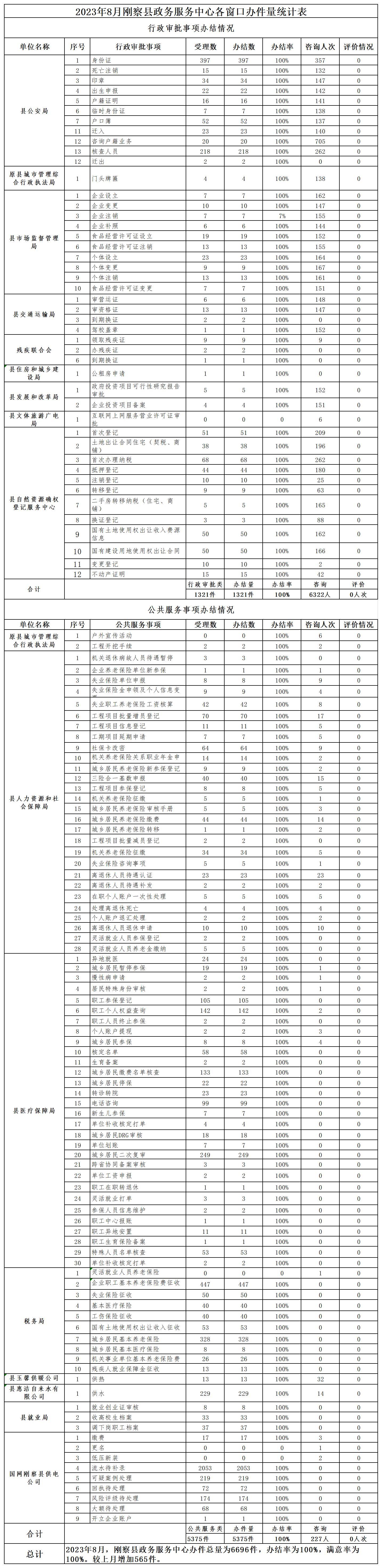 2023年8月刚察县政务服务中心各窗口办件量统计表