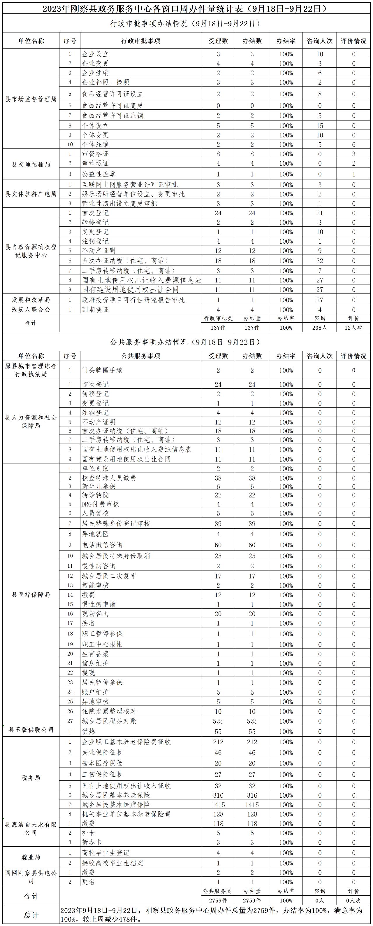 2023年刚察县政务服务中心各窗口周办件量统计表(9月18日-9月22日)
