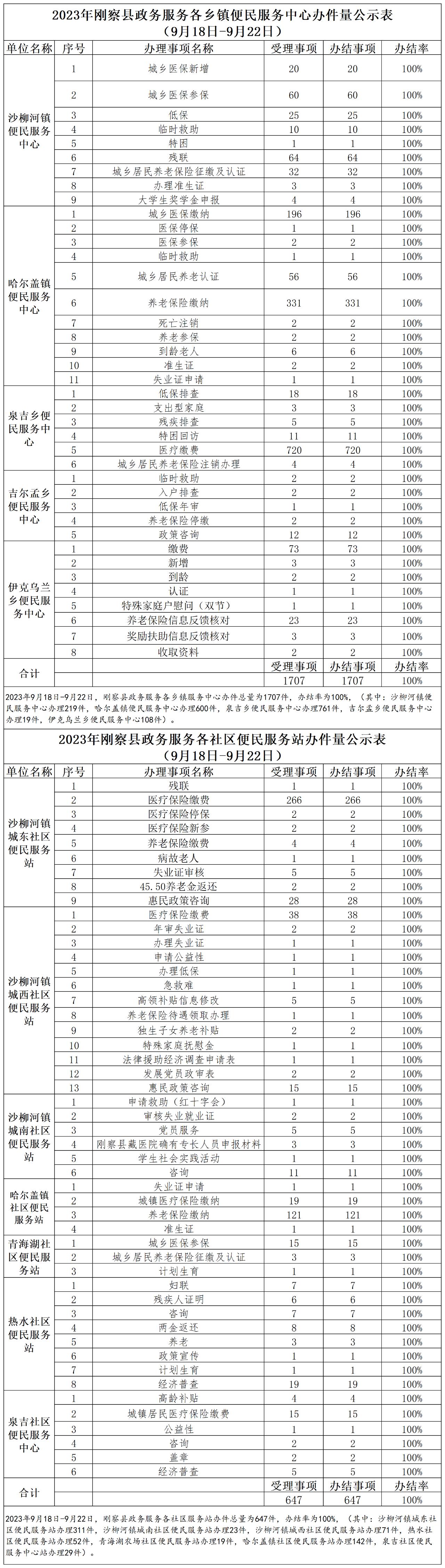 2023年刚察县政务服务各乡镇便民服务中心办件量公示表(9月18日-9月22日)