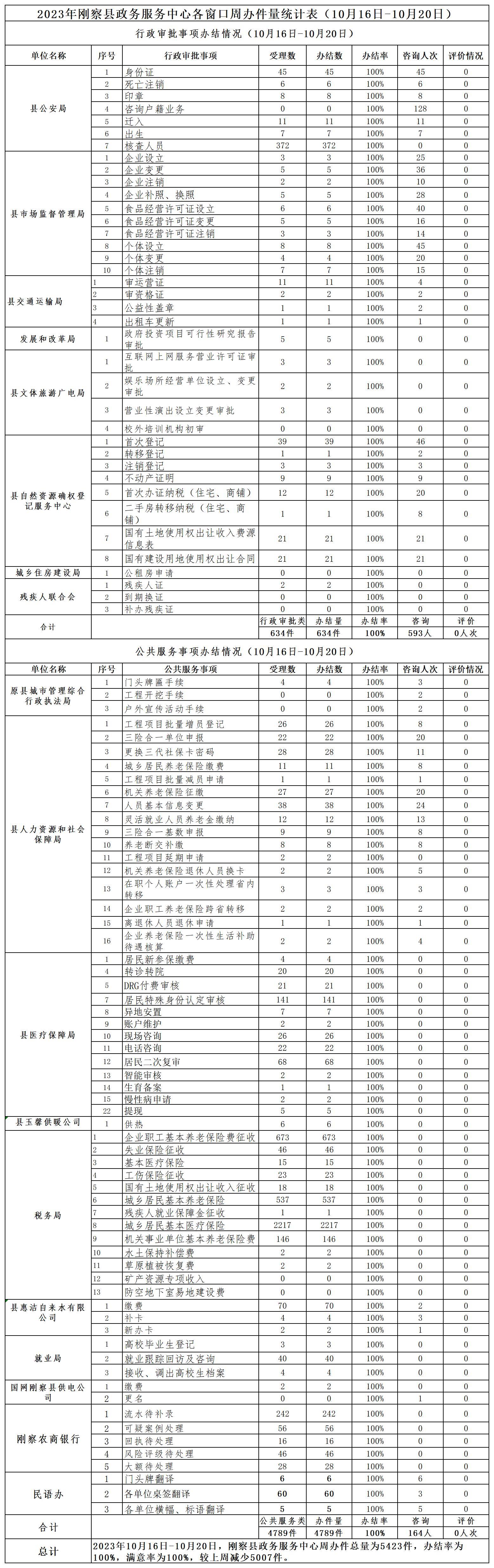2023年刚察县政务服务中心各窗口周办件量统计表(10月16日-10月20日)