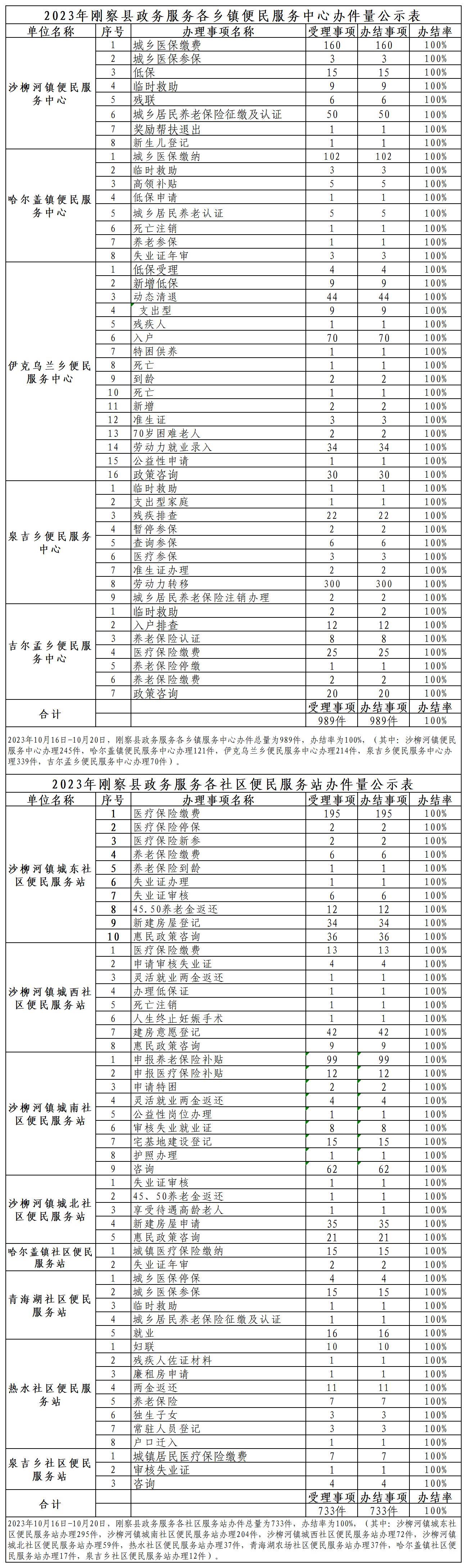 2023年刚察县政务服务各乡镇便民服务中心办件量公示表(10月16日-10月20日)