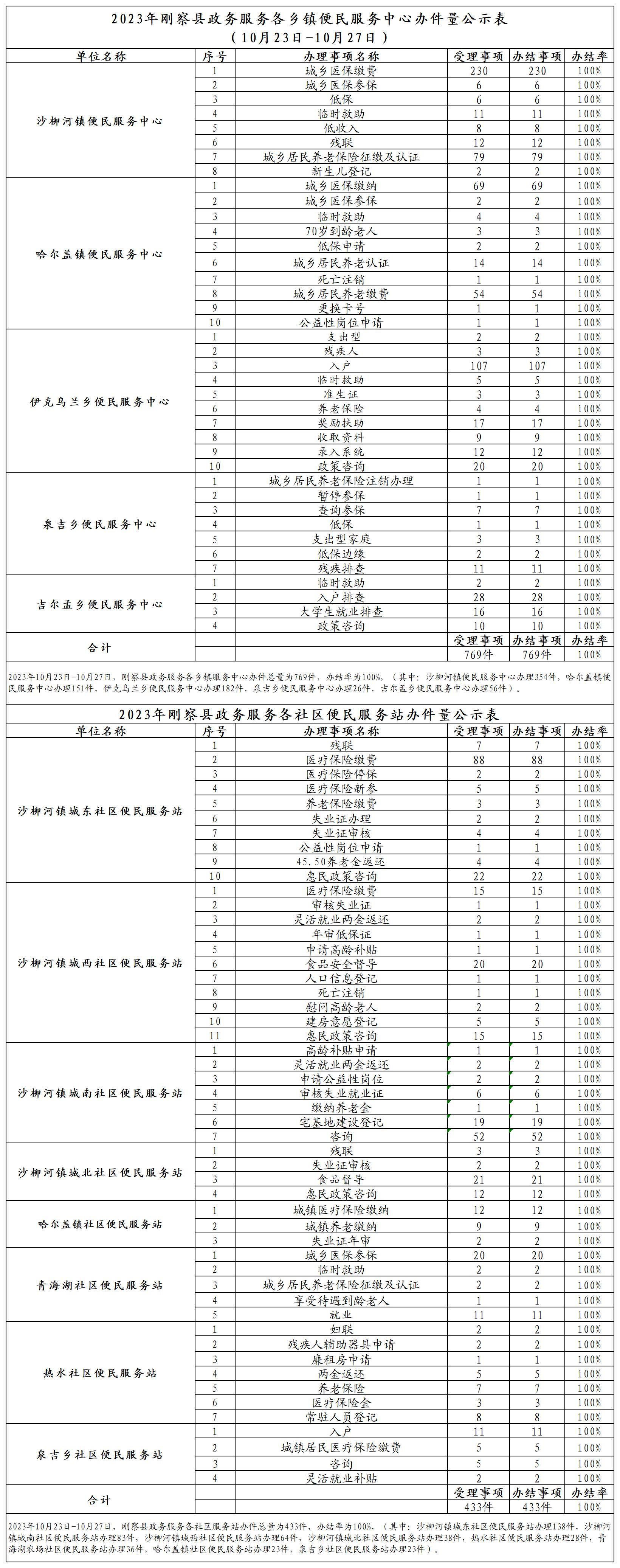 2023年刚察县政务服务各乡镇便民服务中心办件量公示表(10月23日-10月27日)