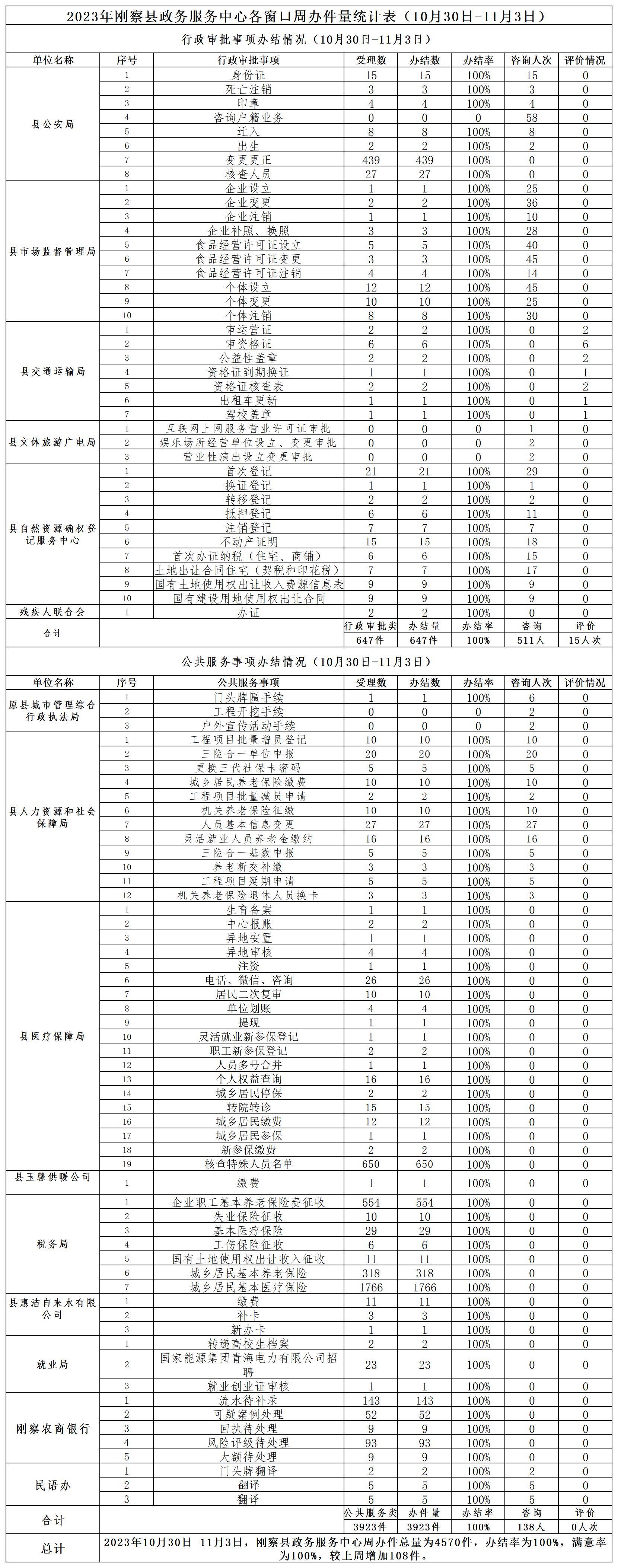 2023年刚察县政务服务中心各窗口周办件量统计表(10月30日-11月3日)