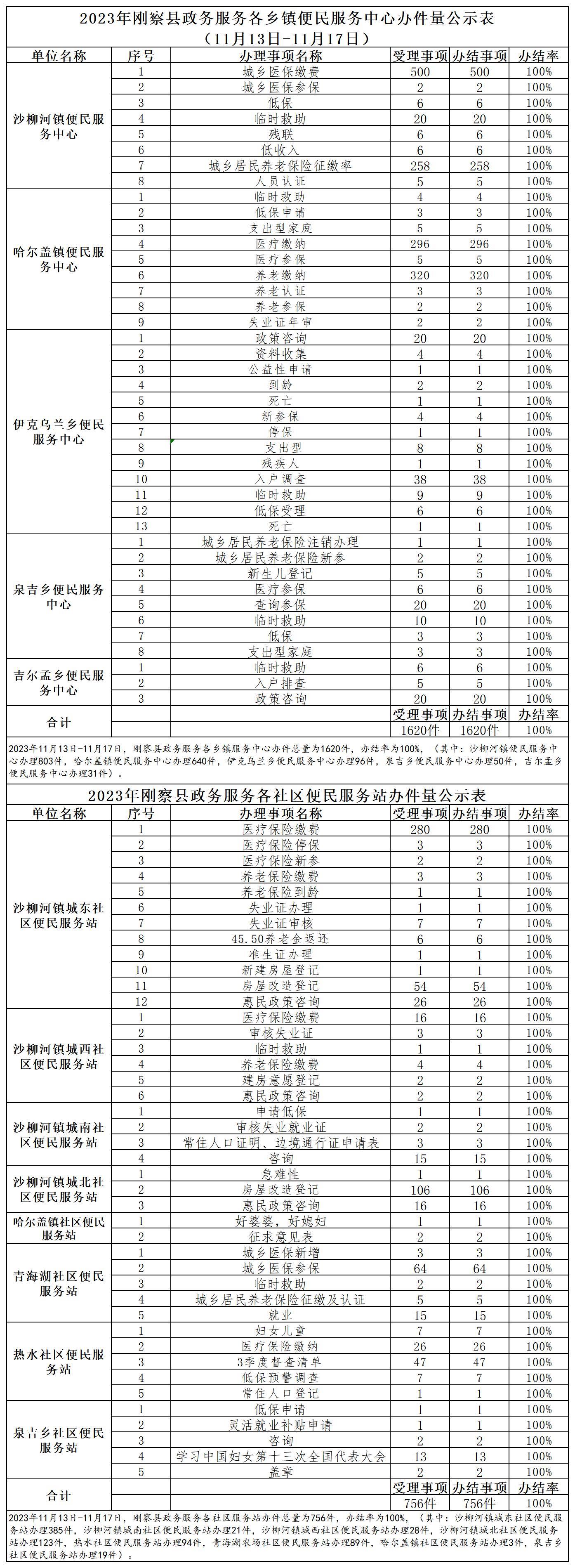2023年刚察县政务服务各乡镇便民服务中心办件量公示表(11月13日-11月17日)