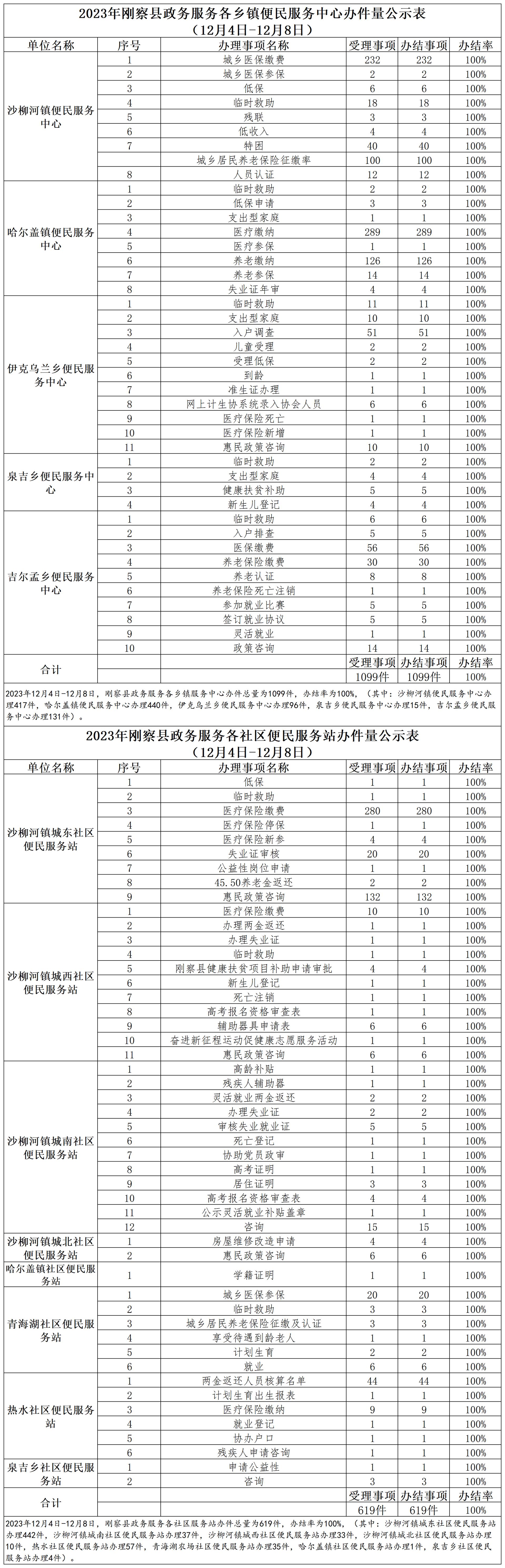 2023年刚察县政务服务各乡镇便民服务中心办件量公示表(12月4日-12月8日)