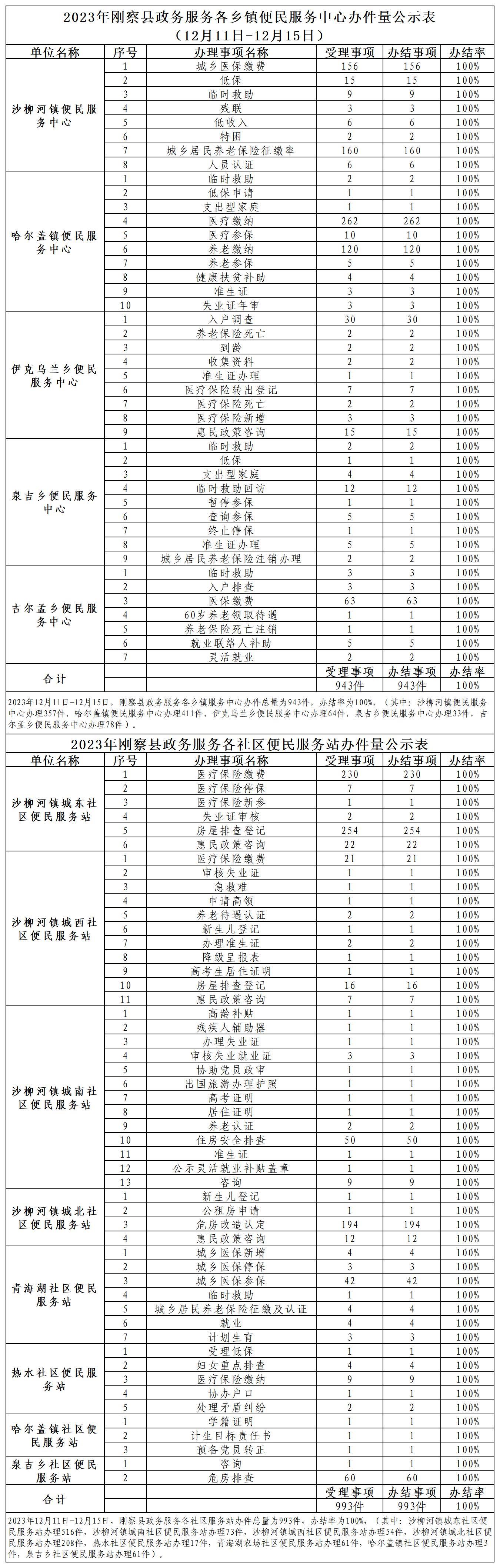 2023年刚察县政务服务各乡镇便民服务中心办件量公示表(12月11日-12月15日)