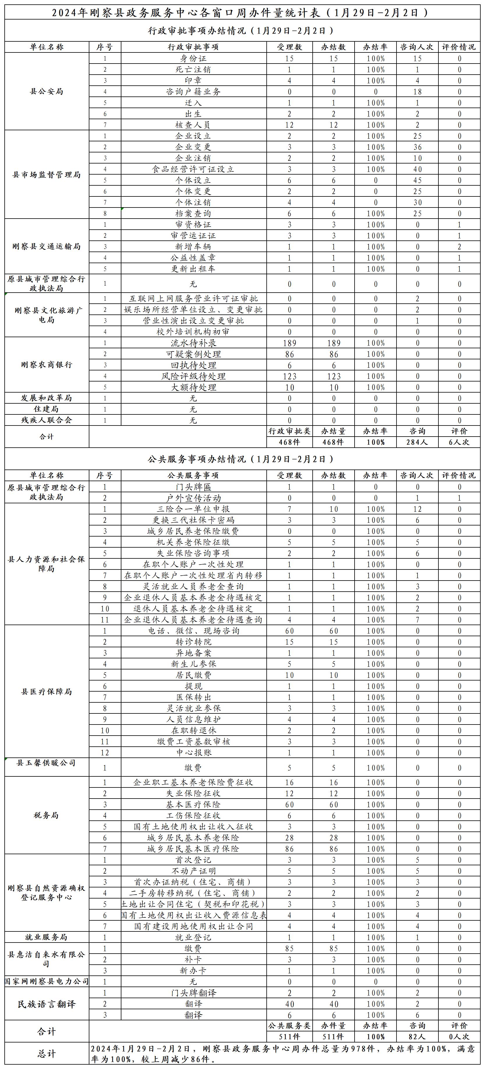 2024年刚察县政务服务中心各窗口周办件量统计表(1月29日-2月2日)