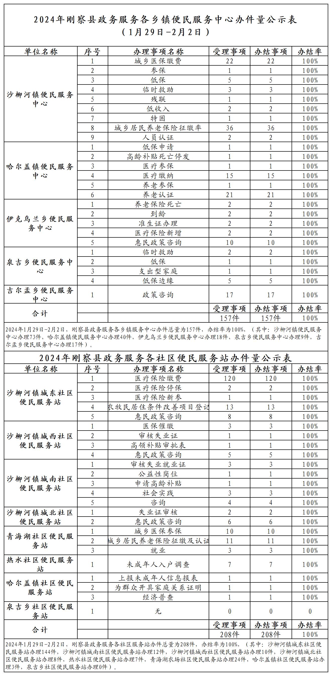 2024年刚察县政务服务各乡镇便民服务中心办件量公示表(1月29日-2月2日)