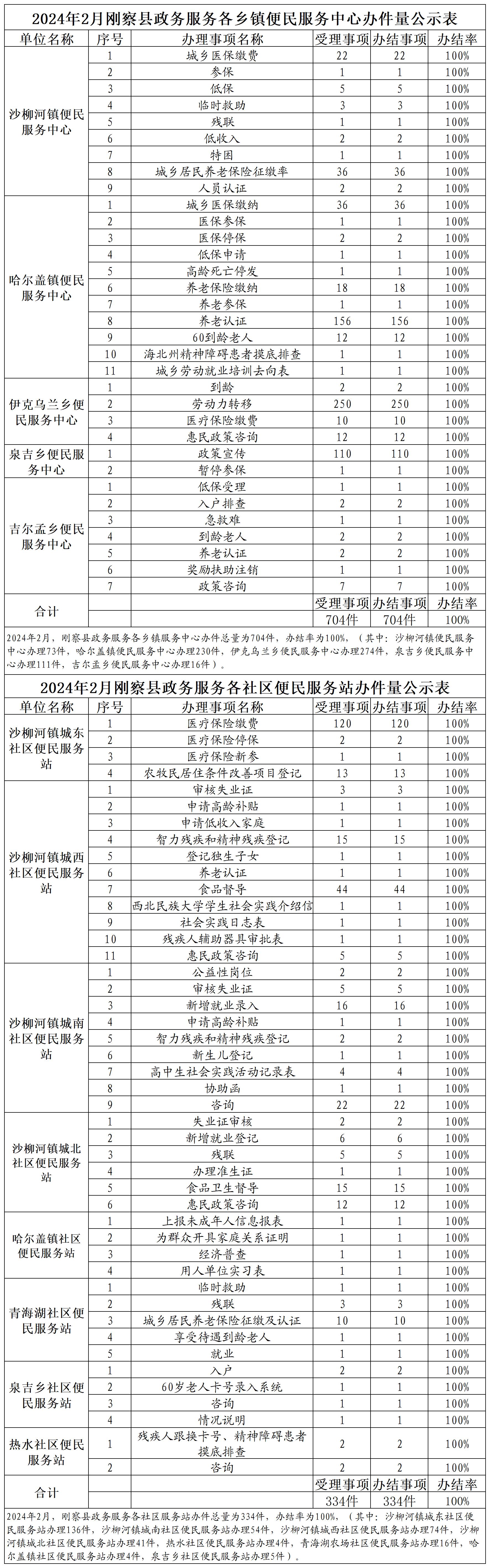 2024年2月刚察县政务服务各乡镇便民服务中心办件量公示表
