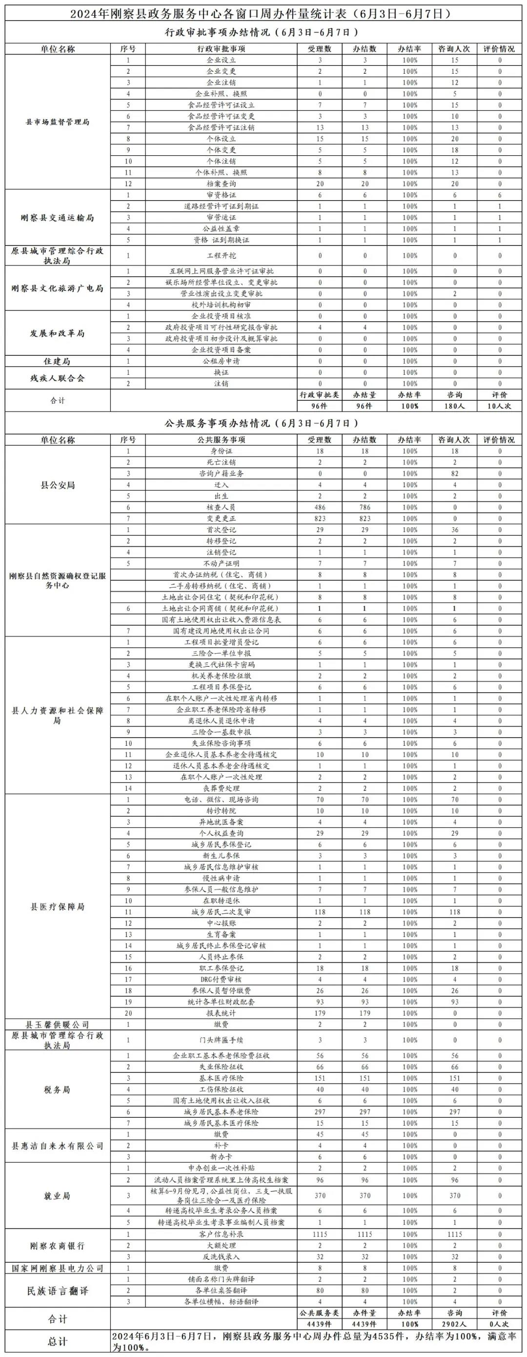 2024年刚察县政务服务中心各窗口周办件量统计表(6月3日-6月7日)