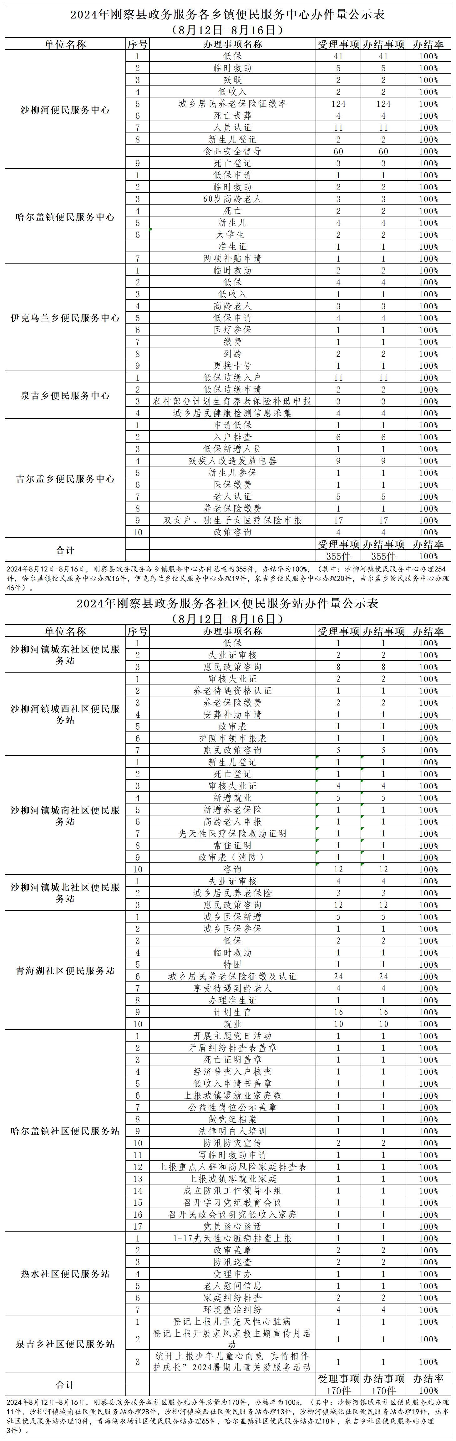 2024年刚察县政务服务各乡镇便民服务中心办件量公示表(8月12日-8月16日)
