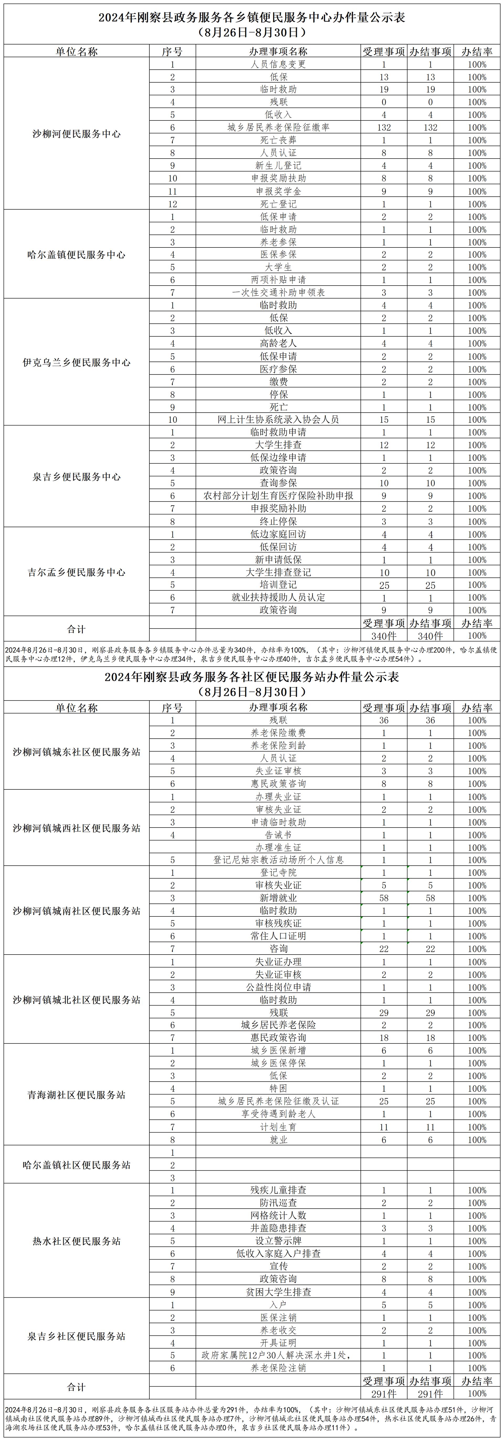 2024年刚察县政务服务各乡镇便民服务中心办件量公示表(8月26日—8月30日)
