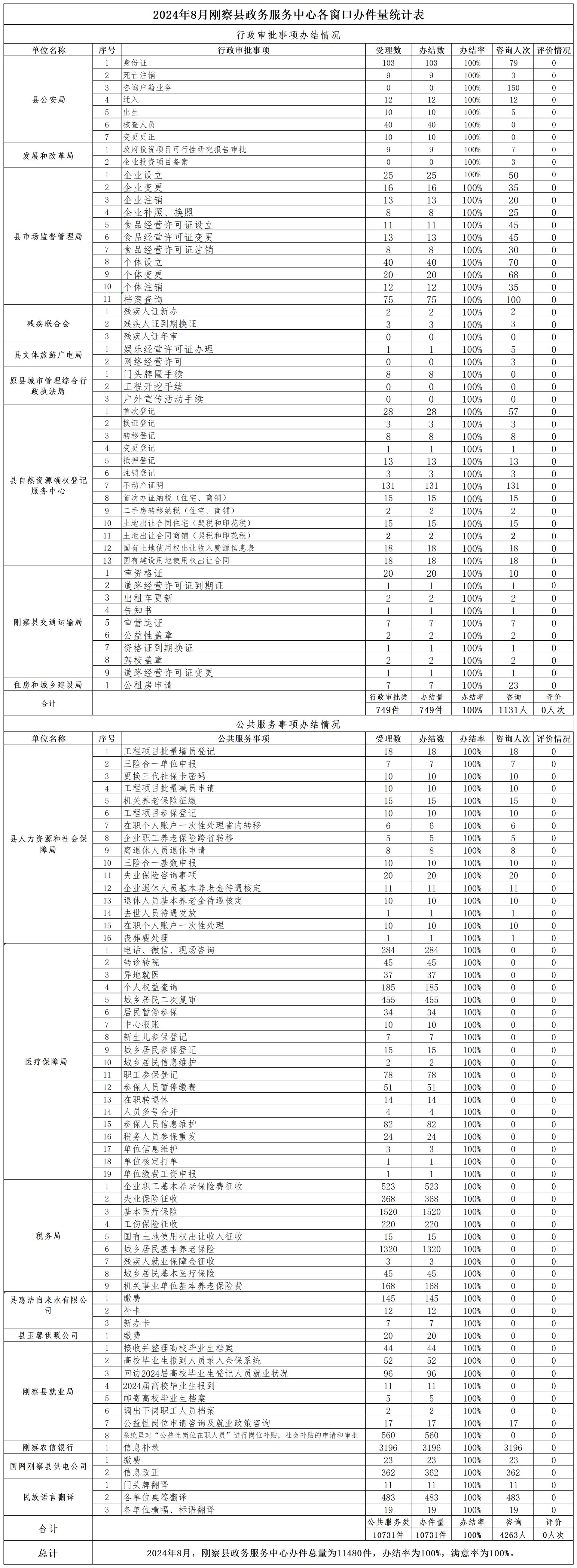 2024年8月刚察县政务服务中心各窗口办件量统计表