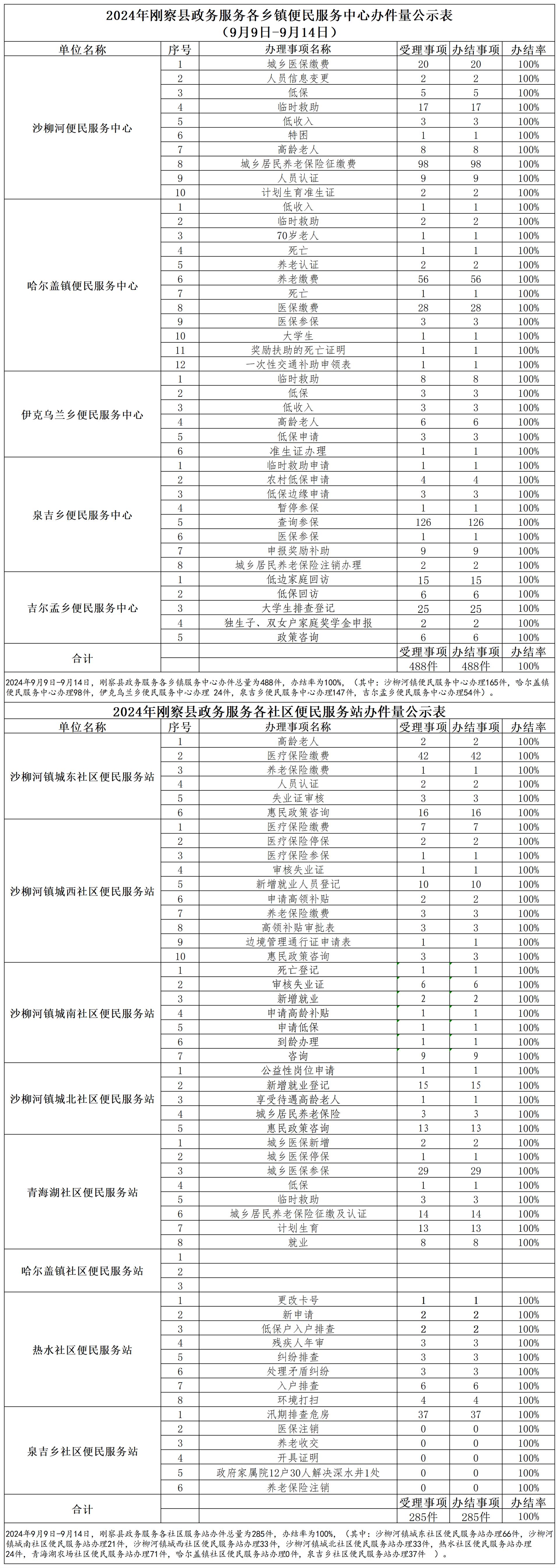 2024年刚察县政务服务各乡镇便民服务中心办件量公示表(9月9日—9月14日)