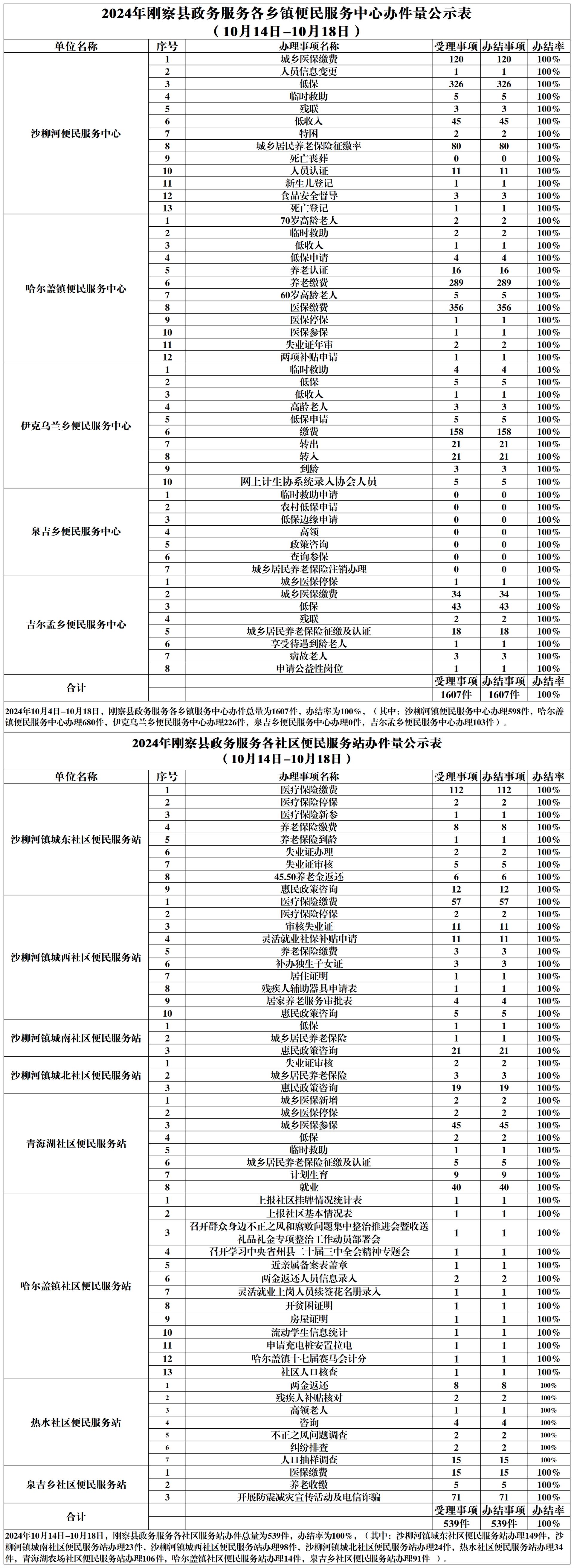 2024年刚察县政务服务各乡镇便民服务中心办件量公示表(10月14日—10月18日)