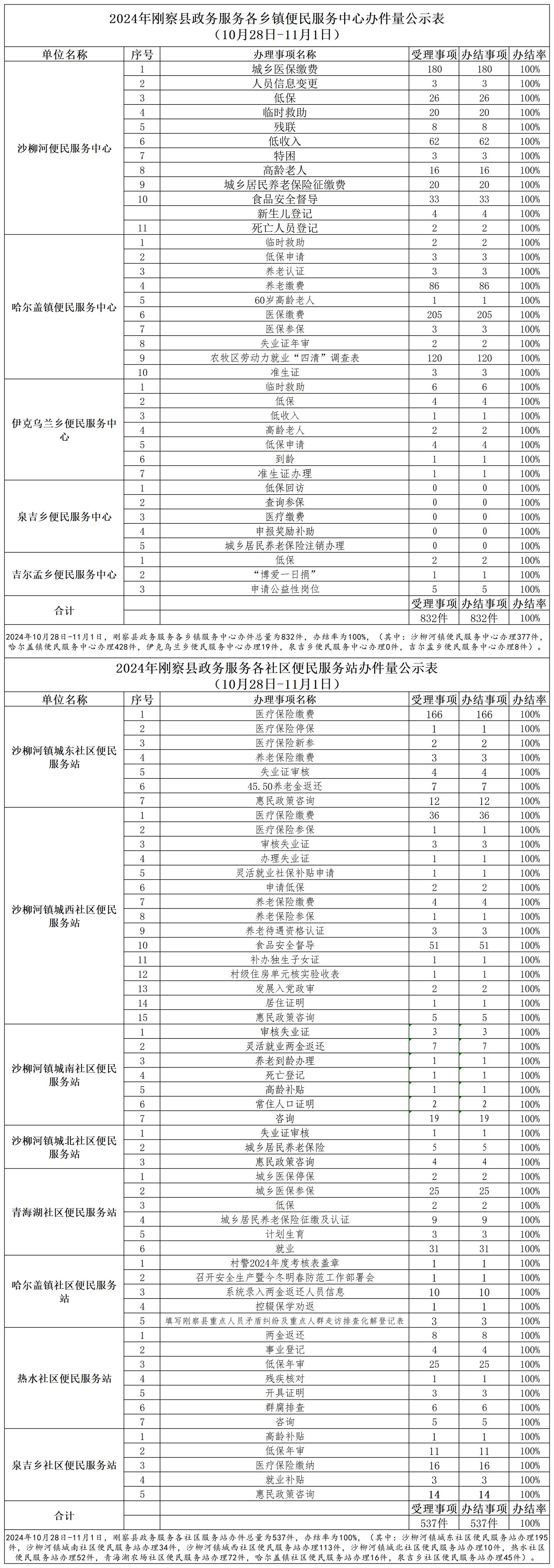 2024年刚察县政务服务各乡镇便民服务中心办件量公示表(10月28日—11月1日)