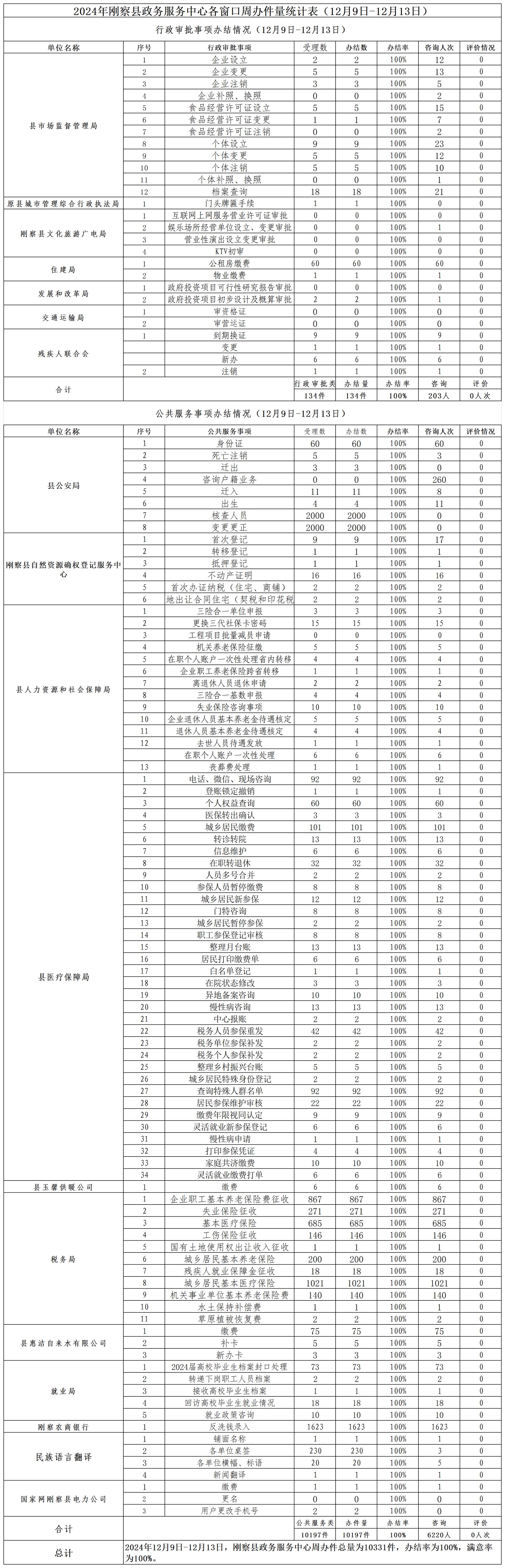 2024年刚察县政务服务中心各窗口周办件量统计表(12月9日—12月13日)