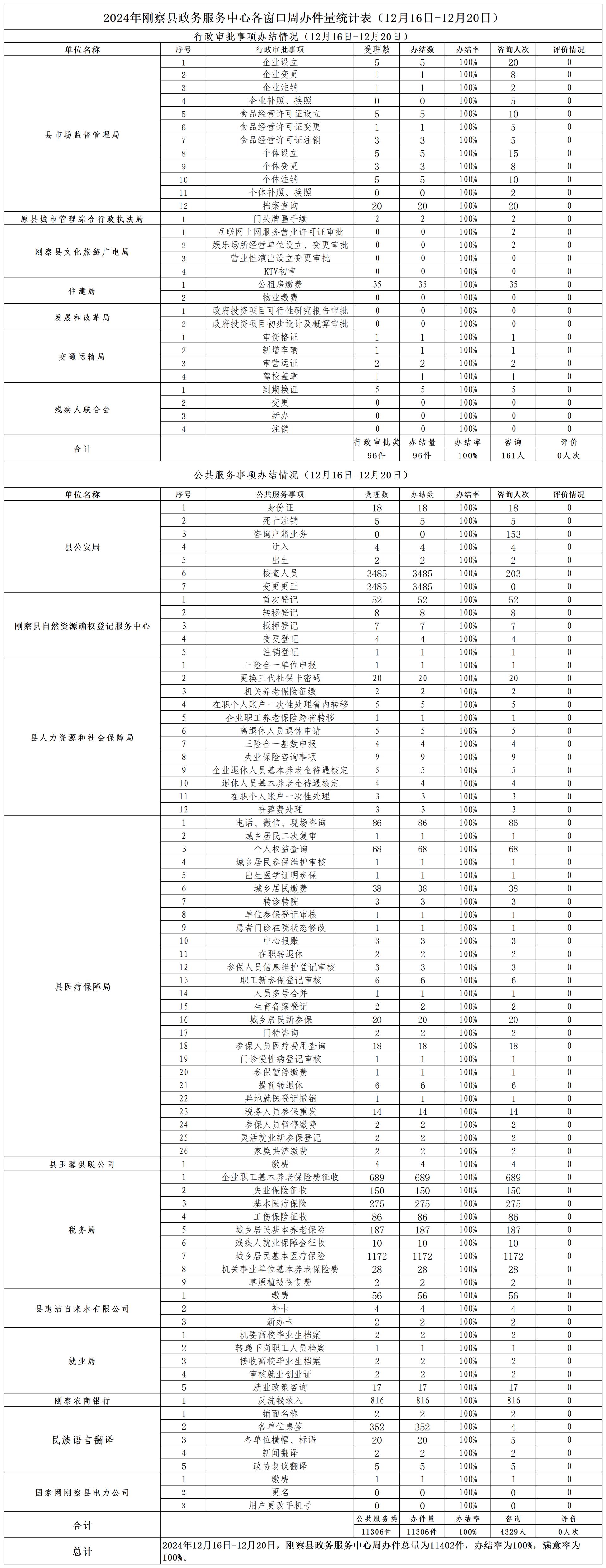 2024年刚察县政务服务中心各窗口周办件量统计表(12月16日—12月20日)