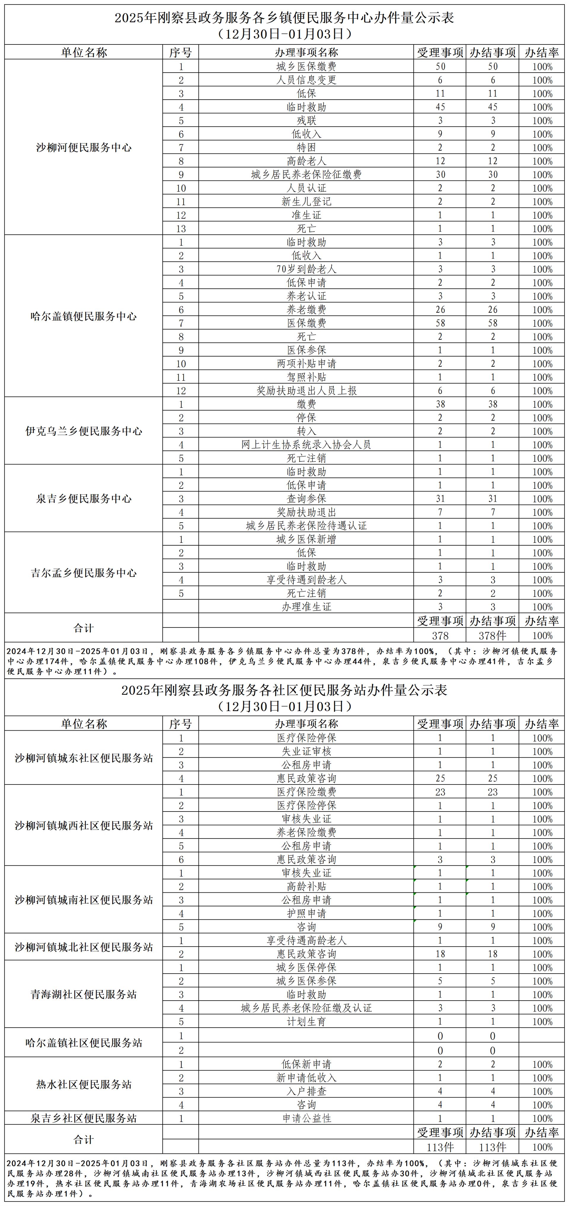 2025年刚察县政务服务各乡镇便民服务中心办件量公示表(12月30日—01月03日)