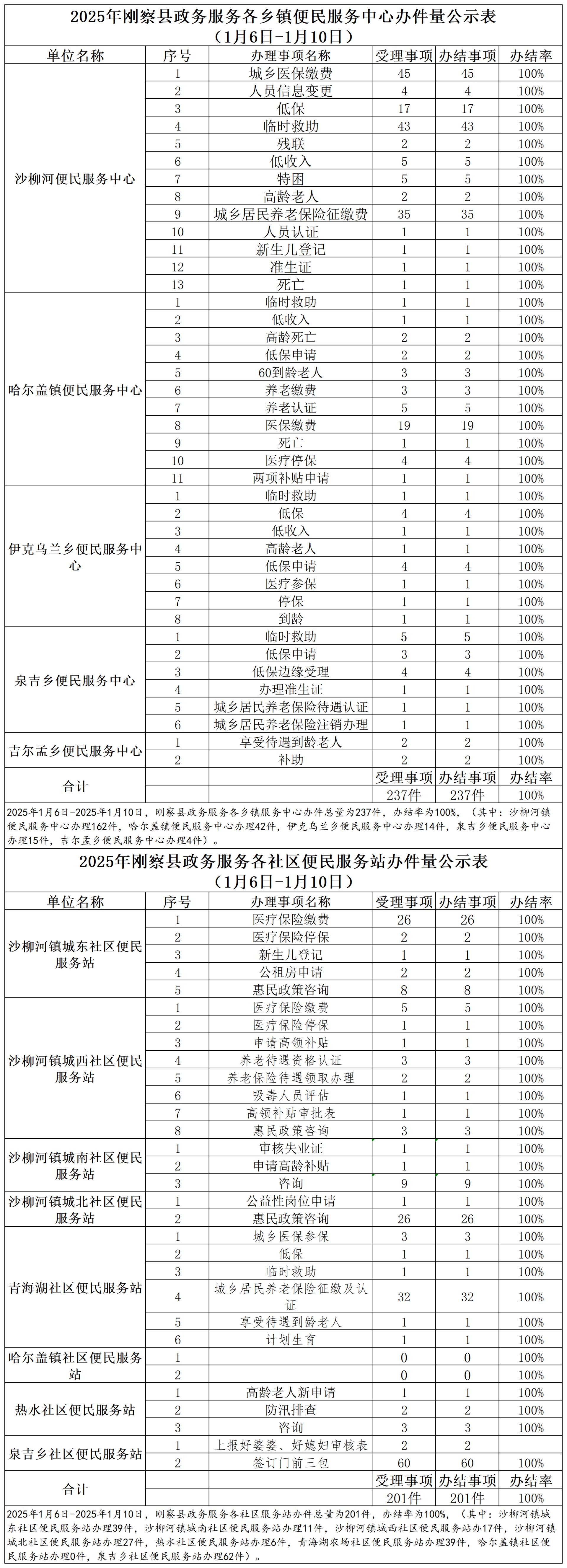 2025年刚察县政务服务各乡镇便民服务中心办件量公示表(1月6日—1月10日)