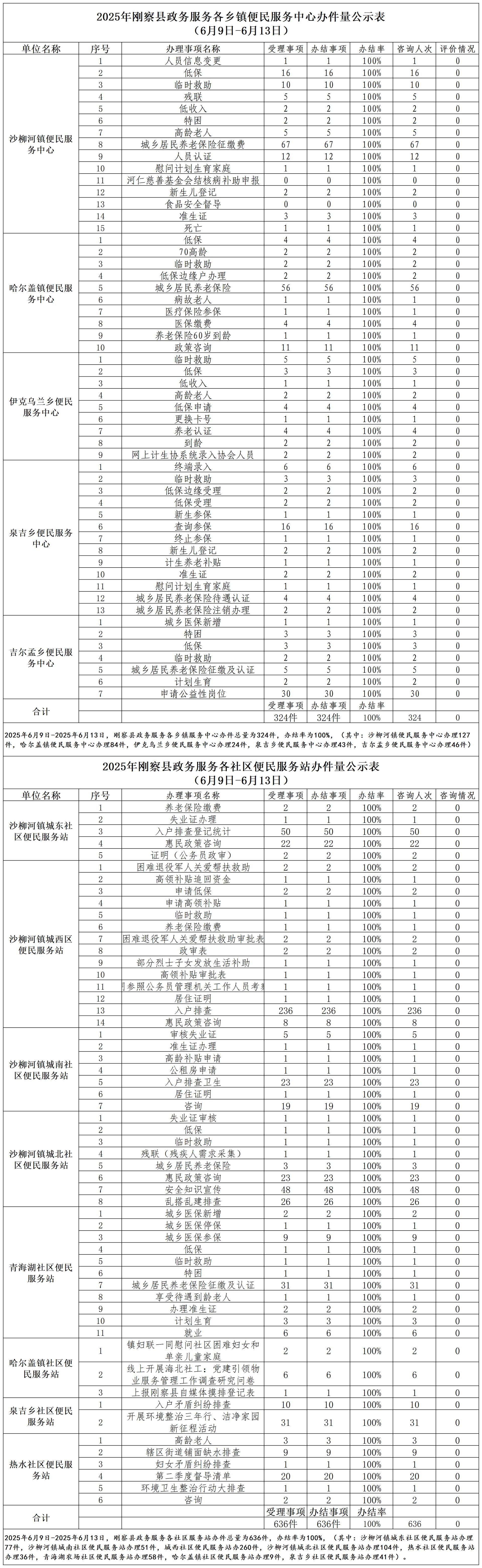 2025年刚察县政务服务各社区便民服务站办件量公示表(6月9日—6月13日)