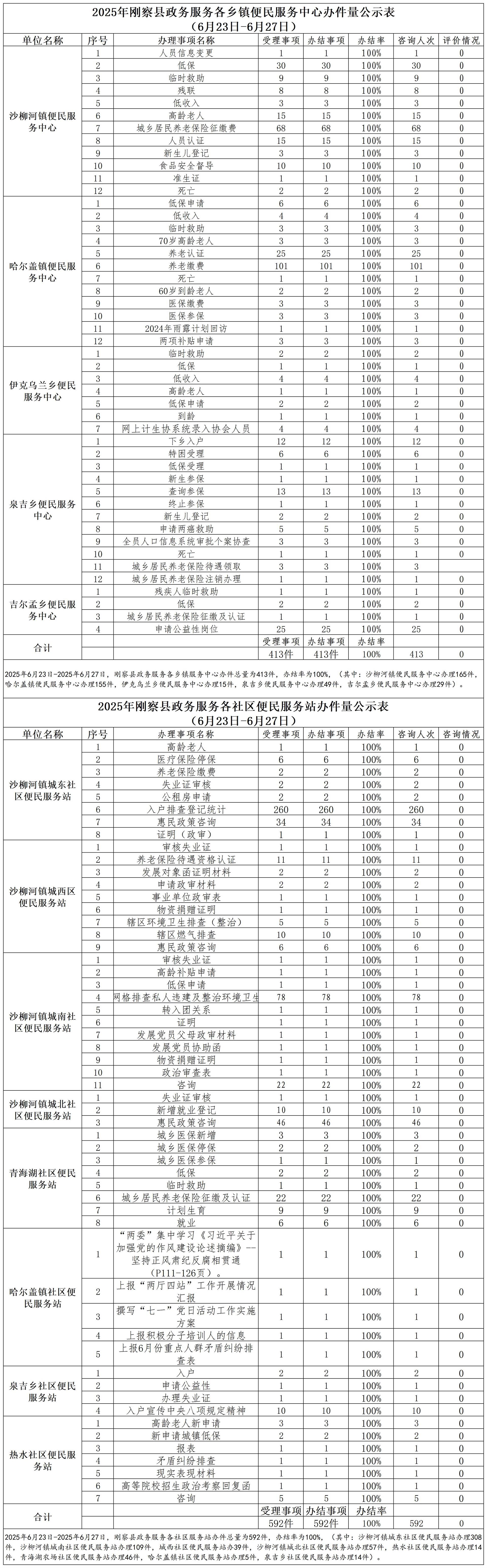2025年刚察县政务服务各乡镇便民服务中心办件量公示表(6月23日—6月27日)