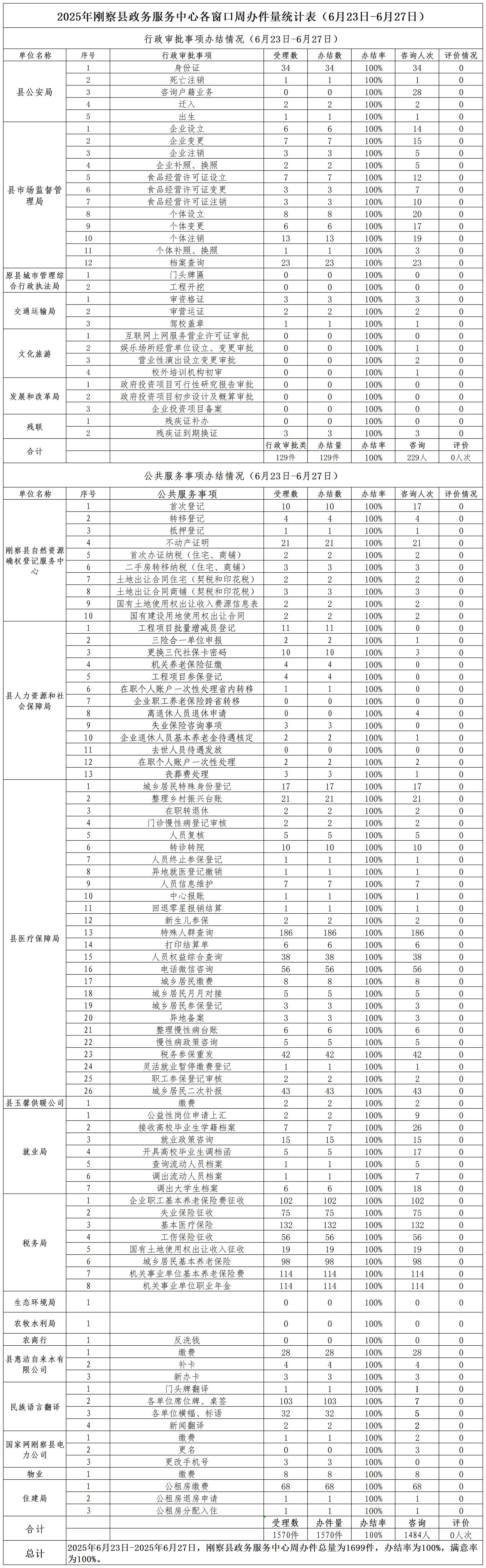 2025年刚察县政务服务中心各窗口周办件量统计表(6月23日—6月27日)