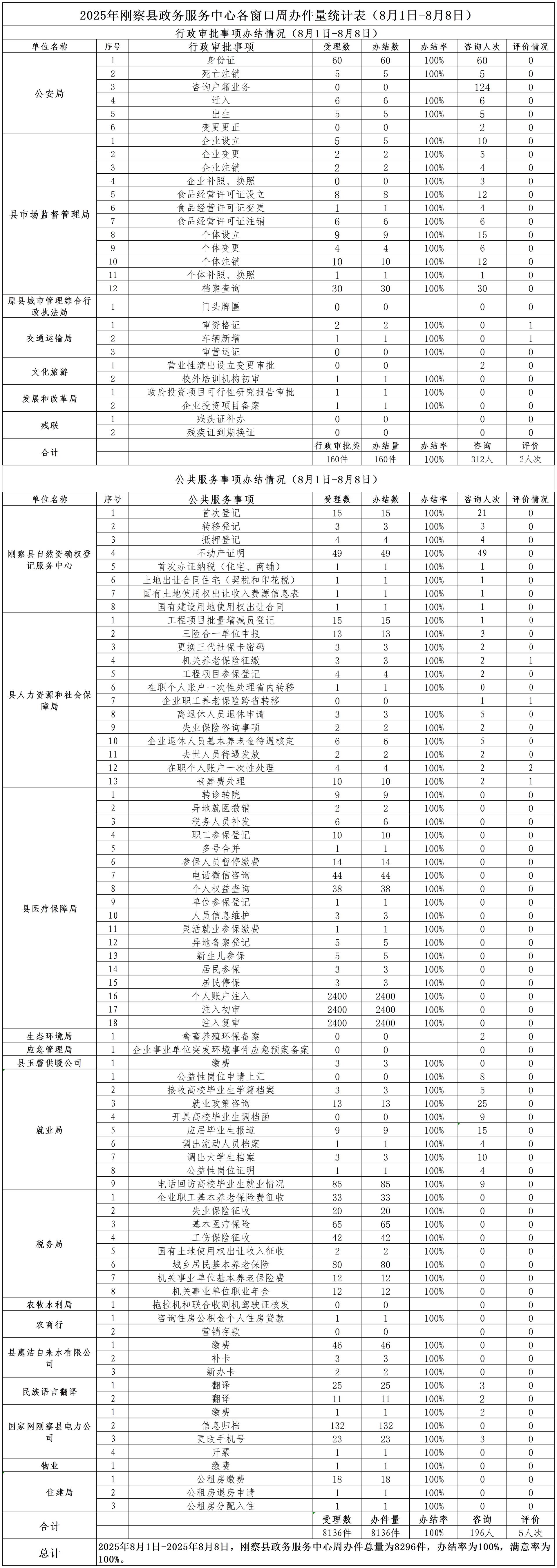 2025年刚察县政务服务中心各窗口周办件量统计表(8月1日-8月8日)