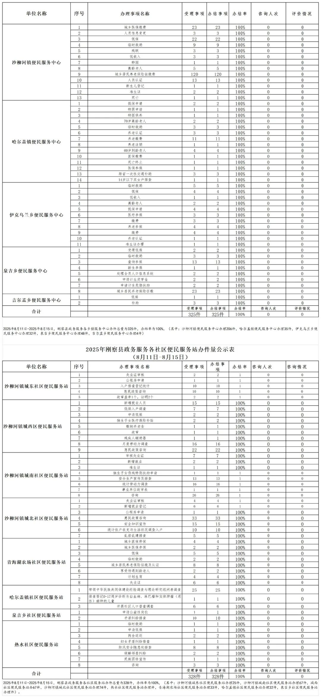 2025年刚察县政务服务各乡镇便民服务中心办件量公示表(8月11日-8月15日)