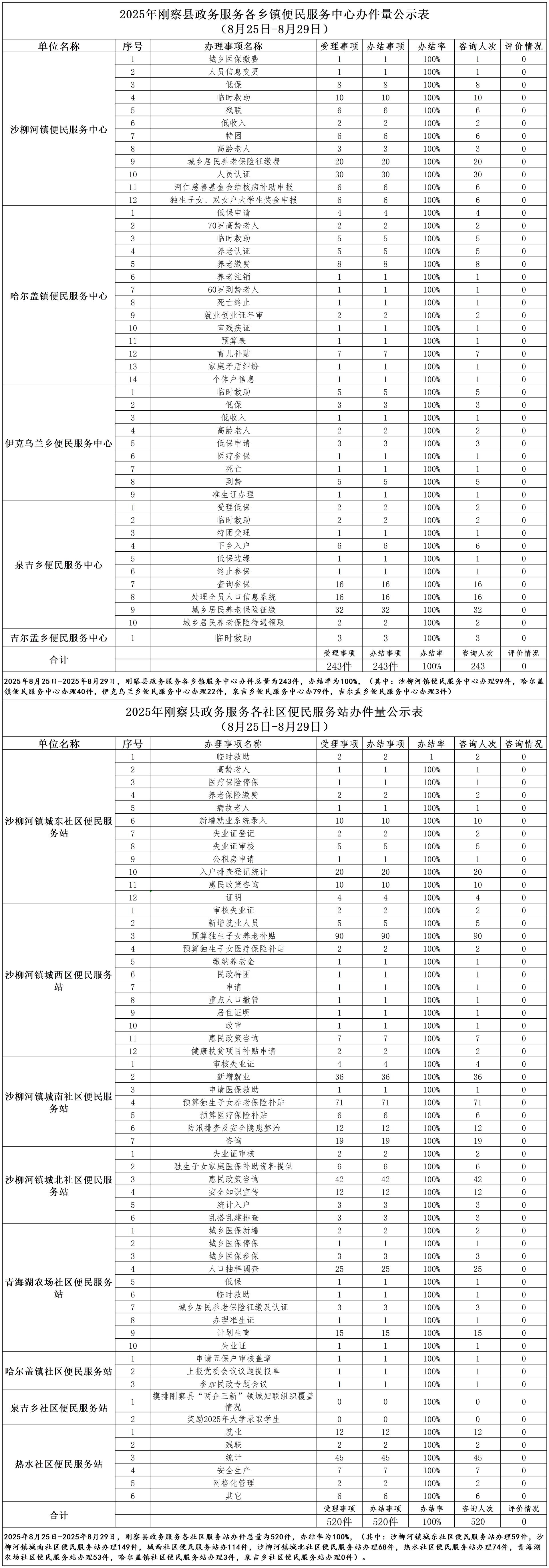 2025年刚察县政务服务各乡镇便民服务中心办件量公示表(8月25日-8月29日)