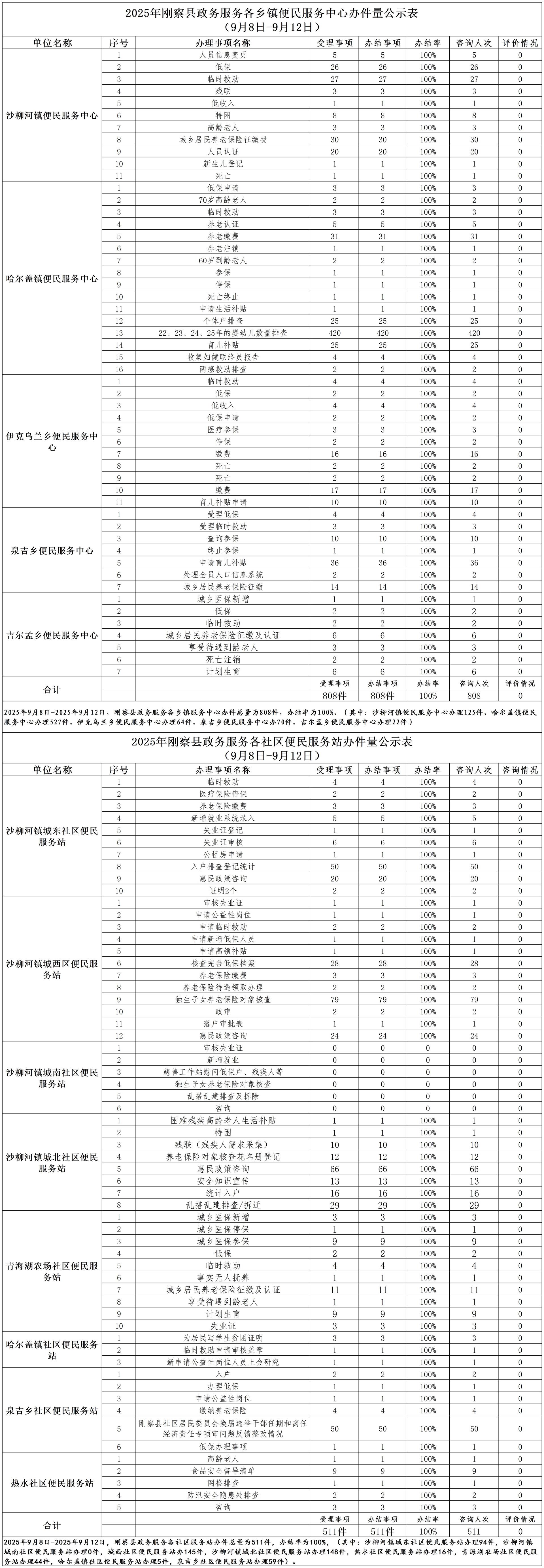 2025年刚察县政务服务各乡镇便民服务中心办件量公示表