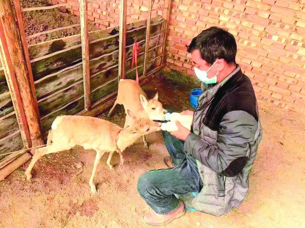 周增本给小普氏原羚喂奶。哈尔盖镇供图。